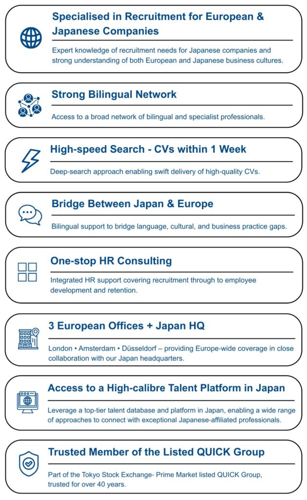 - Strong track record in local hiring for German‑ and English‑speaking roles that do not require Japanese